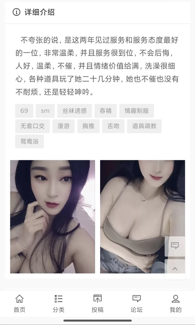 威客管理提示:要求付定金 保证金的,总之提前要钱的都是骗子 妹子长得一般,不过价格便宜适合泻火,我现在推荐一下。。 价格服务:单次是300时间是一个小时 两次是500时间是90分 服务是爱啊陪浴口活丝袜调情漫游制服高跟鞋口爆就这些 不过口爆算爱爱一次 妹子自己有房不上门 可以包夜 包夜是1000。先qq联系 到地方后电话遥控上楼